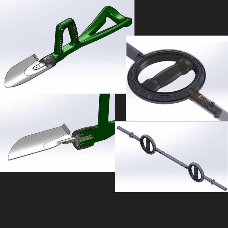 Development of various consumer products. These pictures show the development of a gardening device with exchangeable tool, and the concept for a novel gym barbell with a mechanism to allow handle adjustmentMore information at: Mulch Fork